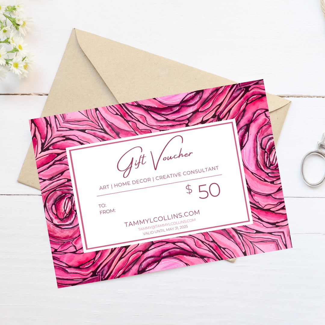 Gift Certificate – $50 Unlock the world of creativity with our $50 Gift Certificate. This thoughtful gift empowers the recipient to explore the captivating realm of art and creativity with Tammy L. Collins. Whether they dream of owning an original masterpiece, commissioning a custom artwork, or adorning their space with fine art prints, this gift certificate is their key to artistic inspiration.